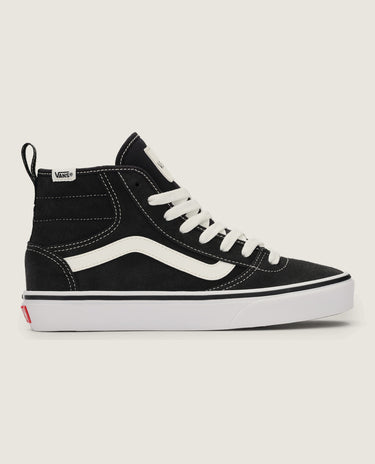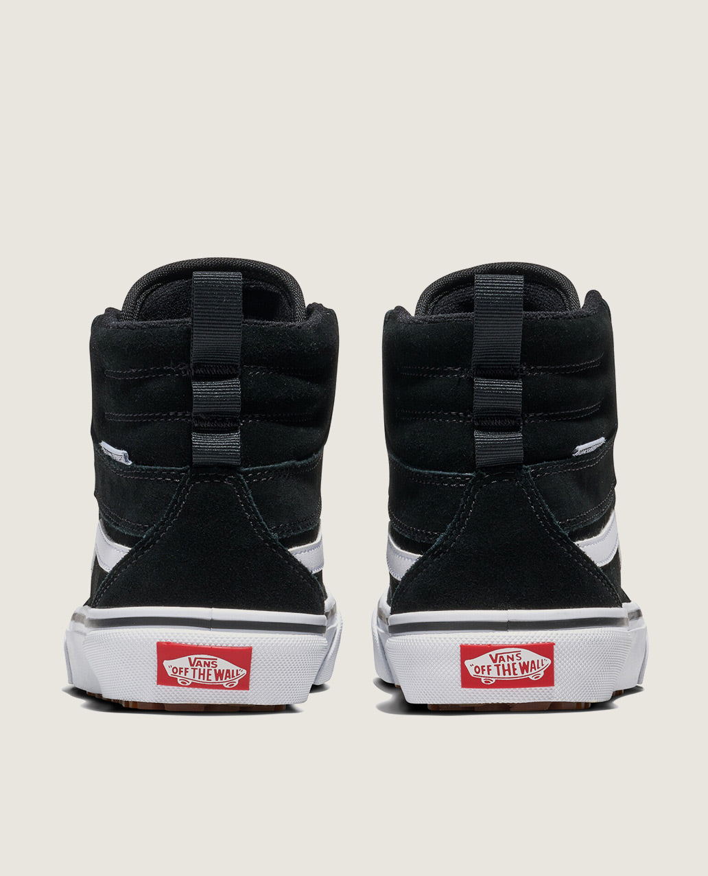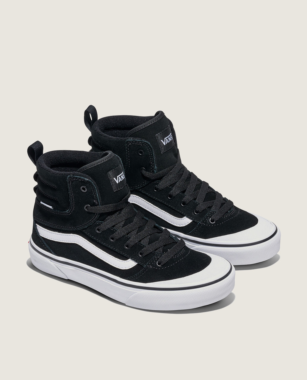 These high-top shoes are built for both durability and comfort, featuring a suede and canvas upper and a robust rubber sole. They are designed with a padded tongue and collar, a secure lace-up closure, and a reinforced canvas toe cap.
